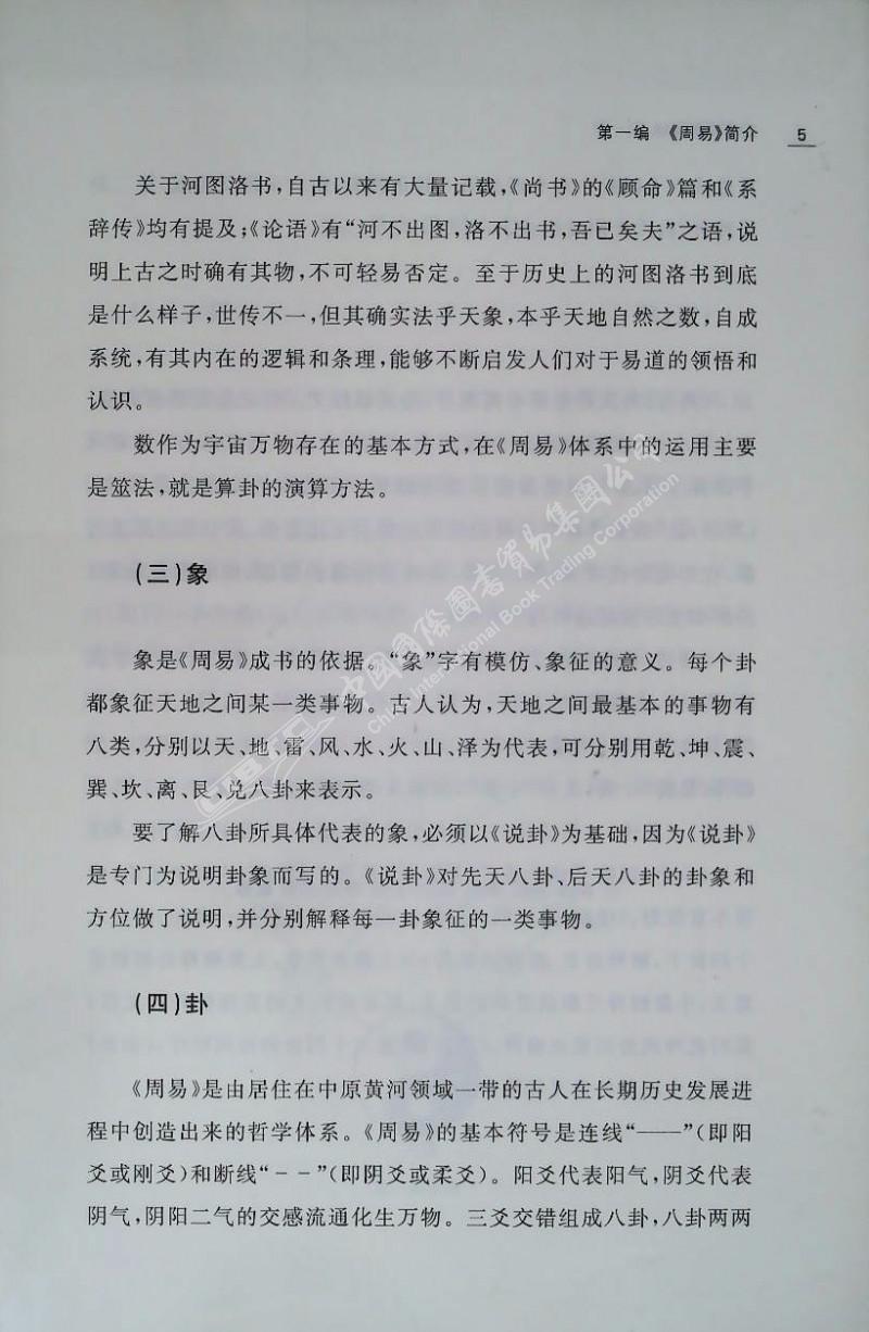《周易》是了解中国传统文化最重要的经典之一,也是中国哲学、东方神秘主义的总源头。中国传统哲学中的政治哲学、形上学、认识论,乃至伦理学和美学都以《周易》哲学为根源。《周易》通过揭示天地变化之道来指导人们的行为,可以说,《周易》塑造了中国独特的“哲学意识”和中国人的宇宙观,对中国几千年来的政治、经济、文化等各个领域都产生了极其深刻的影响。本书依照本系列图书的统一要求,按照对《周易》原文进行简单注释,并译成白话文和英文,然后进行讲解,阐发其主旨和内涵。